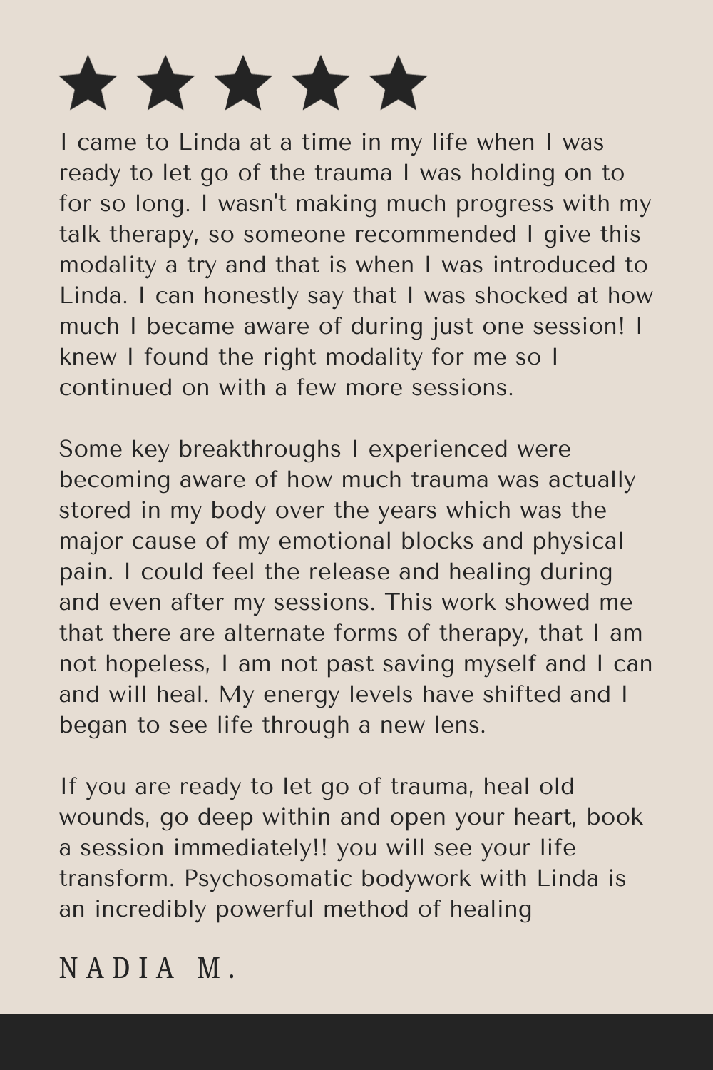 First time clients will receive an in-depth intake session (followed by a full bodywork session) that provides important insight on the current mental, emotional, somatic and energetic imprints and blocks at play in each of these areas. Utilizing what is uncovered, during the intake assessment, and honoring what is present in the body, sessions are then tailored to work on what is uncovered, helping to then unwind and relieve tension and internal blocks to meet desired outcomes.