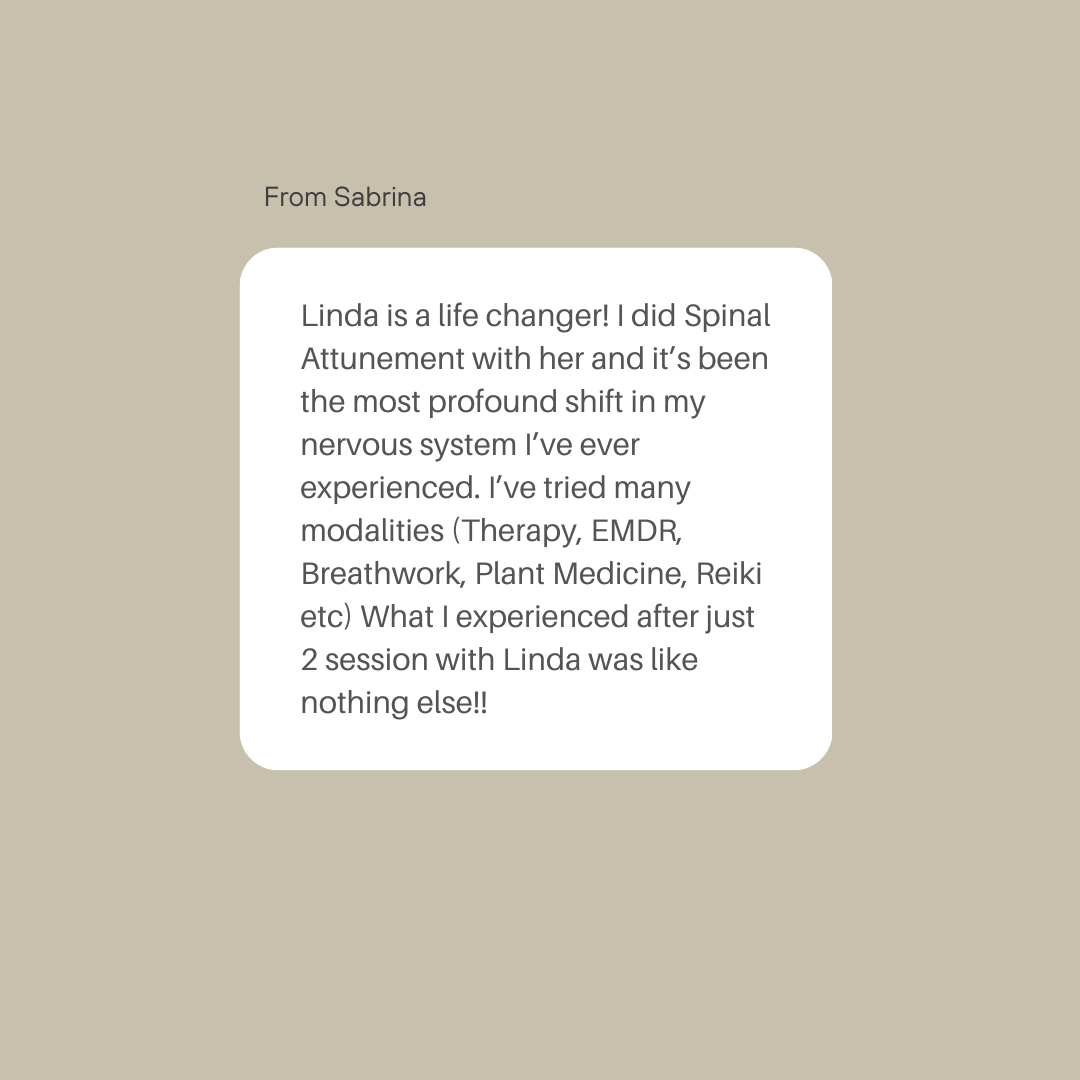With a focus on spinal attunement and incorporating somatic, vagus nerve and energetic anatomy practices ( using minimal to no touch overall), each trauma-informed session focuses on restoring homeostasis within by focusing on finding the precise tension points stored in the spine and nervous system (holding mental, emotional, physical and energetic blocks causing illness, misalignment and disconnection from one's authentic self) and gently unwinding these constrictions through the subtle energy system. A session can be completed in-person or via online.