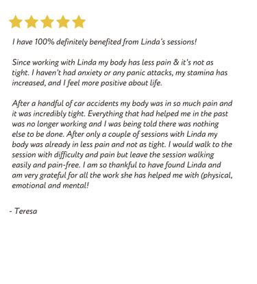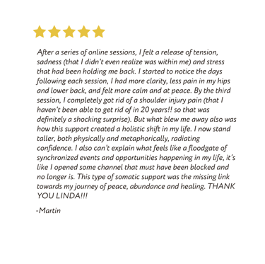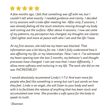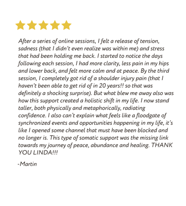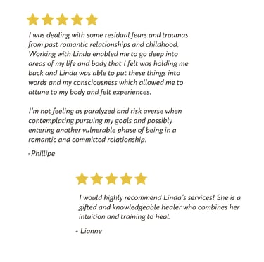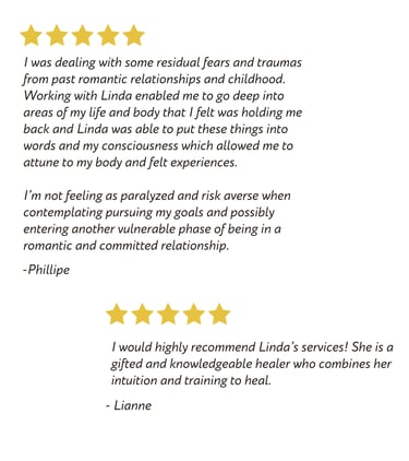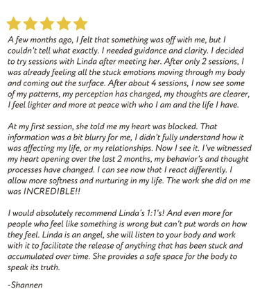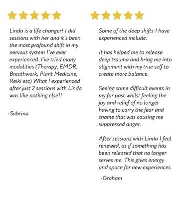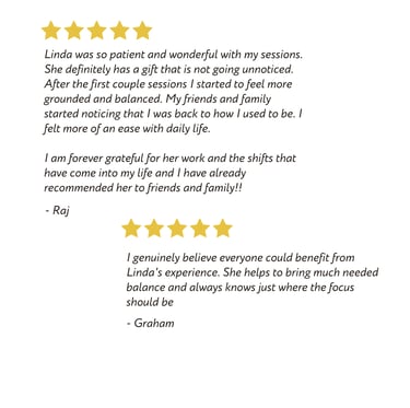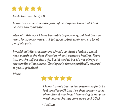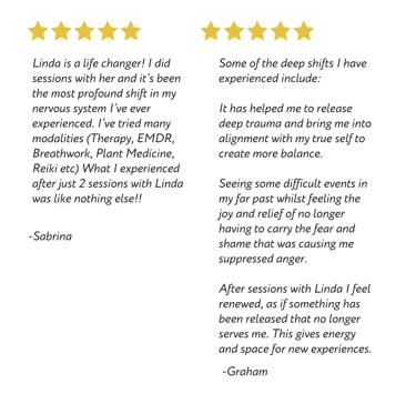 These one-to-one sessions absolutely transformed my approach and exceeded my expectations. You've shown me what is possible around healing Linda and I am mind blown!