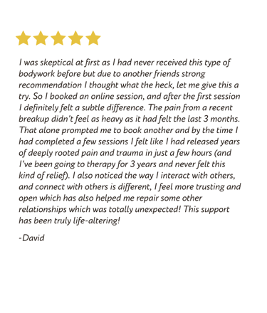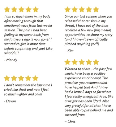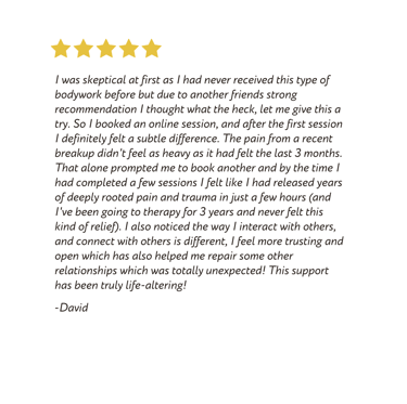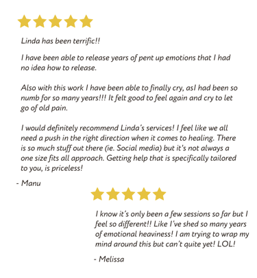 I know it's been only a few sessions so far but I feel so different! Like I've shed so many years of emotional heaviness, I am trying to wrap my mind around this but can't quite yet! LOL!