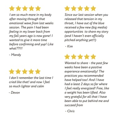 Remember, if your system has been out of sync for a while (which is common for many), it won’t revert to balance overnight. It’s essential we approach this process with care, listening to your body’s signals as we work together to gently unwind those ingrained patterns holding you back. We’ll move at a pace that honors your body and nervous system, adjusting our approach as you grow stronger, clearer, and more open.